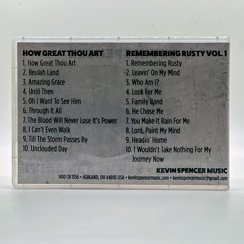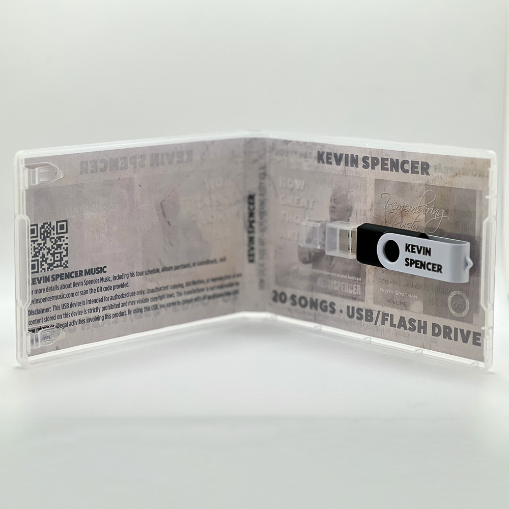 This USB Pack includes two full albums from Kevin Spencer: How Great Thou Art and Remembering Rusty (Vol. 1)—all preloaded as high-quality MP3 files on a USB-A flash drive. Simply plug it into your car’s USB port or any compatible player and enjoy hours of inspiring Southern Gospel music.
