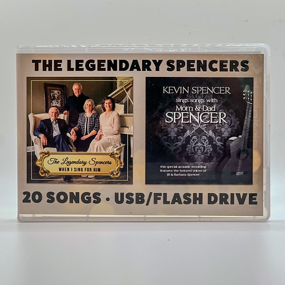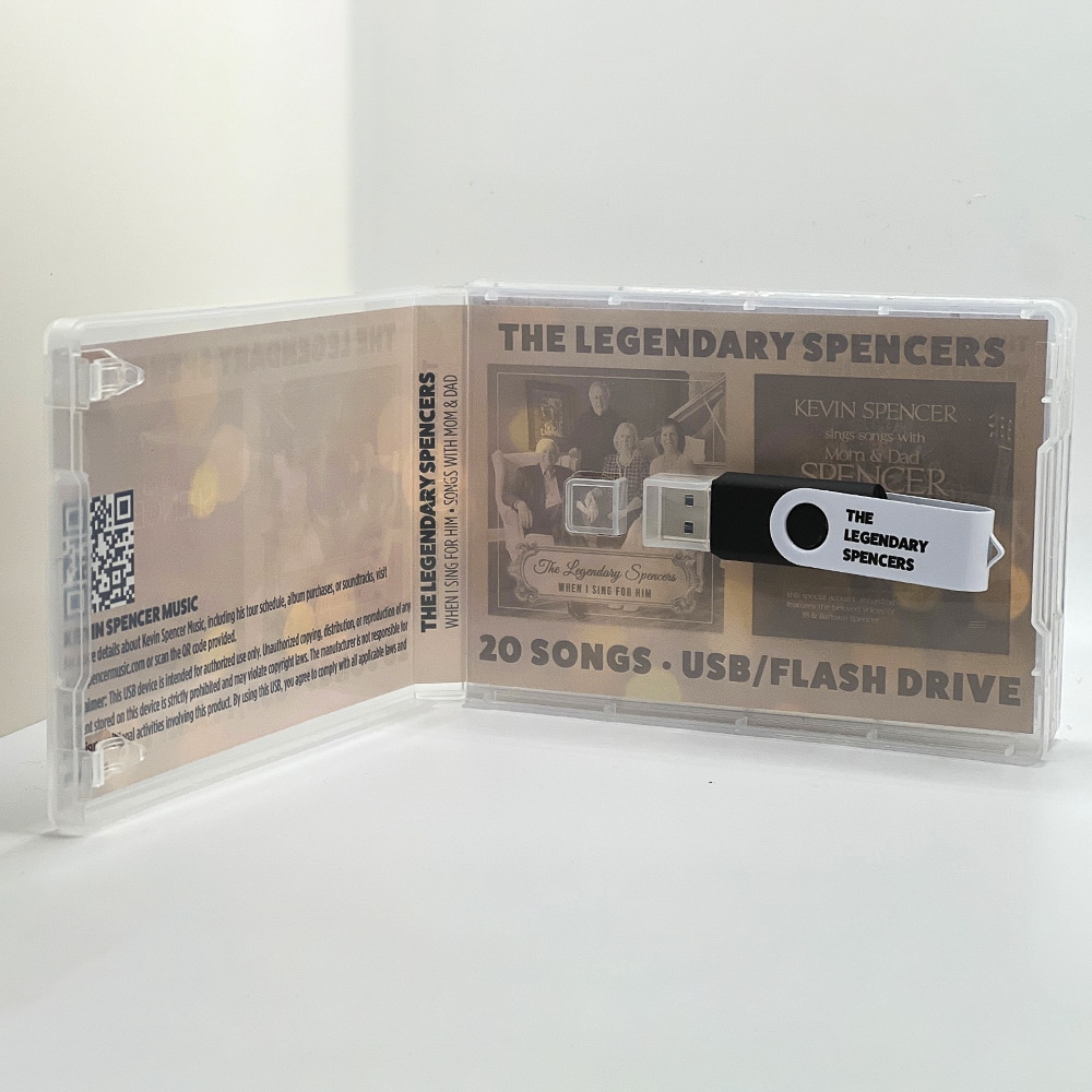 This USB Pack includes two full albums from Kevin Spencer: When I Sing For Him and Kevin Spencer Sings Songs with Mom & Dad—all preloaded as high-quality MP3 files on a USB-A flash drive. Simply plug it into your car’s USB port or any compatible player and enjoy hours of inspiring Southern Gospel music.